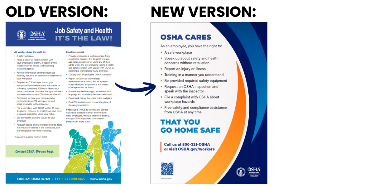 The Occupational Safety and Health Administration (OSHA) has released an updated version of its “Job Safety and Health: It’s the Law!” workplace poster. The revised poster highlights OSHA’s updated messaging, “OSHA Cares That You Go Home Safe,” and features a redesigned layout with streamlined employee rights and updated contact information.