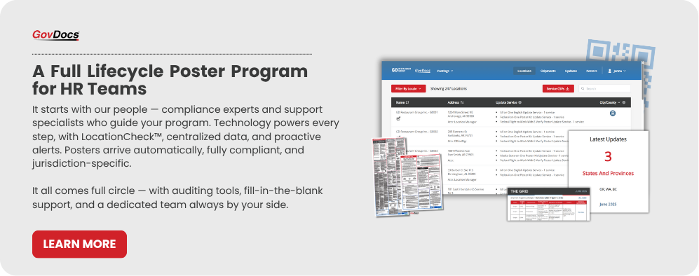 GovDocs is a leading provider of employment law compliance solutions, empowering HR professionals to navigate complex, location-specific labor law postings, minimum wage requirements, and paid leave laws. GovDocs combines innovative technology with dedicated human-touch support to deliver worry-free compliance. Customers benefit from access to a centralized system, trusted resources, and expert employment law support they need, all in one place, to simplify compliance and protect their organization from risk. Trusted by over 35% of Fortune 500 companies, GovDocs focuses on comprehensive coverage of Federal, State, City, and County laws making employment law management seamless for organizations of all sizes. Join the evolution of employment law compliance here!